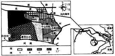 1、综合题 下图为长江中下游某城市位置和功能分区示意图。读图回答下列问题。