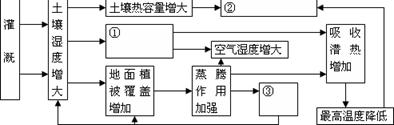 1.图中源于土壤湿度增大,可使空气湿度增大,则必然是地面蒸发的水量增多;同时源于蒸腾作用加强,可使土壤湿度增大,则必然是降水增加;土壤热容量越大,气温变化幅度越小。