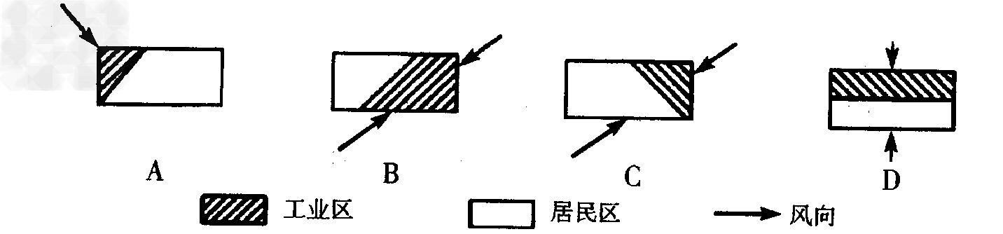 3、单选题 从人们的居住环境考虑,下列四幅图中居民区的分布合理的是