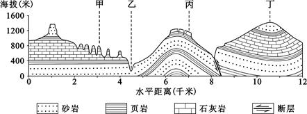 (1)图中甲、乙、丙、丁四处,属于向斜的是?。属于断层的是______。(2分)