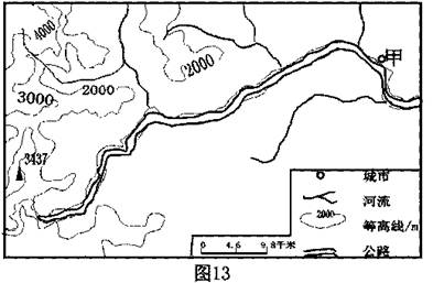图13所示区域年降水量约1500~1700毫米,年雨日约180天。甲地海拔约1000米,1月平均气温约4℃,公路西端海拔约3000米,山地1500米以上分布着云杉、冷杉,林下土层深厚。
