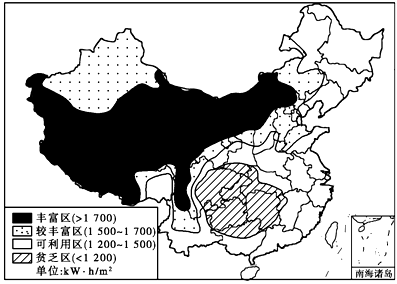 1、单选题 下图是“我国太阳年辐射总量的分布图”,图中太阳辐射丰富区太阳能丰富的原因有( )