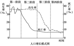 (2)由材料中全年出生人口1 615万人,出生率为12.13‰;死亡人口943万人,死亡率为7.08‰;自然增长率为5.05‰可以判断,2009年我国人口进入第三阶段,人口增长模式的人口增长的特征是低出生率,低死亡率,低自然增长率。