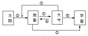 4、单选题 下图中各箭头及其代表符号①②③④⑤表示太阳、地面、大气、宇宙空间之间的热力作用,其中包括太阳辐射、地面辐射、大气辐射、大气逆辐射、削弱作用(吸收、反射和散射),回答下列各题。