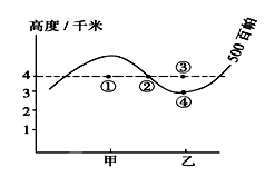 本题解析:从上图的等压线图可知,气压大小应该为①>②=④>③;从曲线图可以看出,甲地的气流是上升的,多为阴雨天气;因为气温要比乙地高,所以气流会发生上升运动;甲地气流上升后,形成了低气压,乙地则气流下沉,形成了高气压,所以气流是由乙地吹向甲地,故选C.