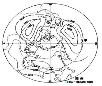 【小题1】读图,根据图中等压线的分布,结合海陆轮廓判断,陆地气压低,海洋气压高,说明北半球此时是夏季。根据等压线数值,甲群岛受高压控制,A错。夏季,乙岛屿受副热带高压控制,B错。南北半球季节相反,正值南半球的冬季,C对。北极圈内有极昼现象,D错。