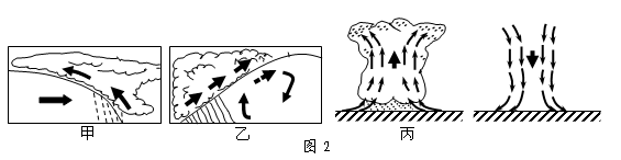 本题解析:本题考查天气系统。根据表1该天气系统过境造成阴雨天气,且气温明显下降,故判断为冷锋影响,为图2中的甲图。