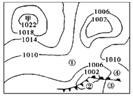 本题解析:本题考查等压线分布图的判读和天气系统的影响。(1)图示甲处等压线闭合,中心气压高,表示高压中心,也称反气旋;高压控制,盛行下沉气流,则天气晴朗。(2)图示冷锋将向②移动,故②将出现阴天、刮风、降雨、降温等天气。(3)图示锋面气旋位于北半球,故暖气团位于南部的②③。(4)图示④位于暖锋的锋前,形成连续性降雨。(5)当低压中心位于厦门东部,则厦门位于北半球低压中心的西部,可画出风向,低压在沿海,可能为热带气旋,形成台风。