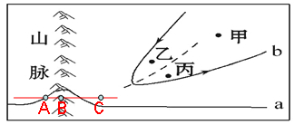 小题1:地球自转线速度旋半径越大,线速度越大,山脉处地势高,地球自转线速度大于同纬度的两侧地区(如下图B大于AC),地球自转线速度等速线应该向速度低的地方凸出,结合图中山脉处地球自转线速度等速线向北凸出,说明越往北地球自转线速度越低,故可以判断图示地区应该位于北半球。图中稳定风向轨迹呈逆时针,北半球低压中心呈逆时针辐合,故可判断甲地位于低压中心。