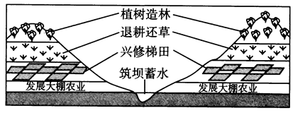 3、单选题 甘肃省定西市属于黄土高原的丘陵沟壑地区,多年来定西人总结了“山顶植树造林戴帽子,山坡退耕还草披褂子,山腰兴修梯甲系带子,山下覆膜建棚挣票子,沟底筑坝蓄水穿靴子”的治理开发模式(如下图)。读图,回答下列各题: