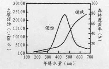 (1)解答本题关键在于判图,弄懂降水量与土壤侵蚀强度关系,找两个关键降水量点即降水量为450mm和600mm前后土壤侵蚀强度的变化。当降水量小于450mm时,土壤侵蚀强度随降水量的增加而快速增强;降水量大于450mm时,土壤侵蚀强度随降水量的增加而迅速减弱;降水量大于600mm时,土壤侵蚀强度变化不大。