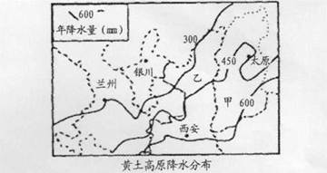 材料二黄土高原年降水量分布图和乙地某年的经济结构表。