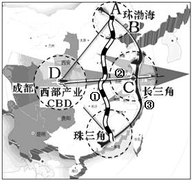 ①京沪沿线?②沿海?③港、澳、台 ?④东北老工业基地4.图中A、B、C、D是组成我国“弓箭型”经济格局中的四个核心城市,下列关于其说法正确的是5.环渤海、长三角、珠三角、成渝地区成为我国经济发展的“四极”,根据所学知识判断,下列关于我国经济发展“四极”的说法正确的是