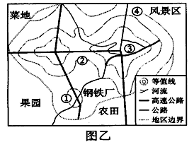 ?1.甲图中,线段a、b、c依次表示何种城市用地的付租 能力2.乙图中,地租分布等值线并不呈现同心圆,而是有明显的凹凸。造成局部地租分布等值线向城外凸出的主要因素是3.若要在乙图的①②③④处中选一处建大型仓储式超市,最好选在