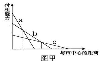 2、单选题  城市功能分区取决于这块土地的租金高低和各种活动的付租 能力两个方面。甲图表示各类城市用地付租 能力与市中心距离的关系;乙图表示某城市地租分布等值线。读图,回答问题。