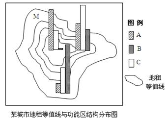 1.A、B、C分别代表2.M处地租等值线明显向外凸出的原因是