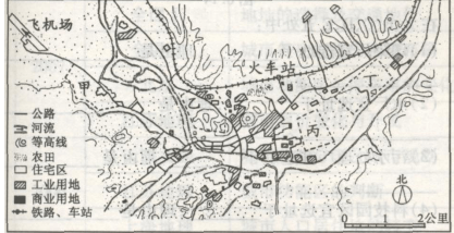 1.从合理布局城市功能的角度考虑,下列用地类型正确的是2.从影响该城市功能分区的因素考虑,下列叙述正确的是