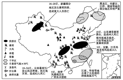 1、综合题 读“2007年7月我国主要自然灾害事件示意图”,回答下列问题。(7分)