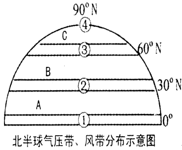 4、综合题 读“北半球气压带、风带分布示意图”,回答问题。(12分):