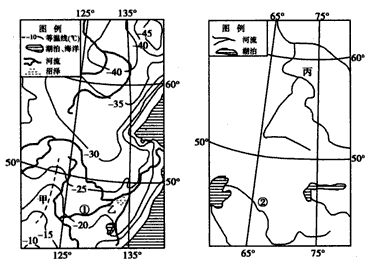 等温线弯曲原因:甲地位于大兴安岭东侧,冬季风越过大兴安岭,下沉(或背风坡)增温。甲地气温高于同纬度两侧,致使等温线向北弯曲。