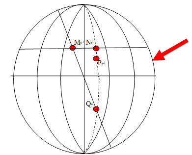 小题2:P点的纬度为30°,M点的纬度大于30°,则任何一天M点正午太阳高度角一定小于P点,A选项错误;M、Q两地的纬度值相等,一个北纬、一个南纬,所以Q点的昼长等于M点的夜长,B选项正确;上题分析出MQ为晨线,可以确定太阳直射北半球(如图),北半球为夏半年,太阳从东北方向升,则日出时物体影子朝向西南,C选项错误;没有信息能推出P点的准确昼长,D选项错误。