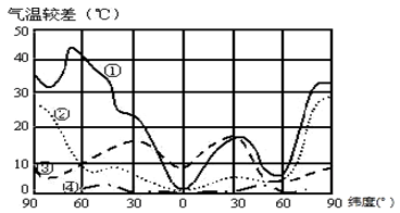 5、单选题 图中①②③④四条曲线为大陆、海洋气温年较差、日较差随纬度变化图,读图,回答下列小题。