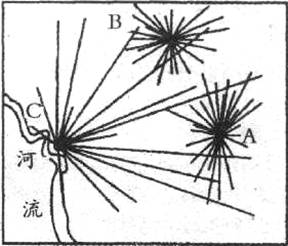 1.分析表格中的数据,结合图中A、B、C三城市的市场距离的远近即可画出服务范围(市场距离之内即为服务范围)。但要注意:不同等级城市的服务范围是层层嵌套的.也就是说A、B、C三城市的服务范围会有重叠部分。