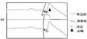 3、单选题 图中甲、乙两地位于同一经线上,相距300公里,乙地年太阳辐射总量少于甲地。读图回答问题。
