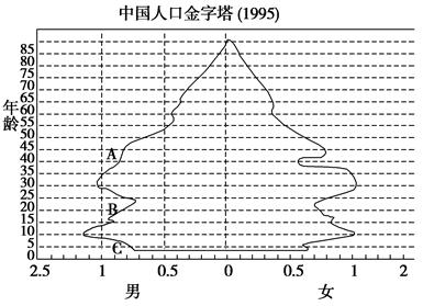 (1)从中国人口金字塔中看出,我国人口增长有A、B、C三个明显低谷,试简要说明其中B低谷出现的主要原因是什么?