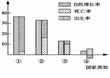 小题1:①、②国家类型自然增长率过高,与我国不符,我国由于实行了计划生育政策,自然增长率是比较低的,④国家类型自然增长率低于零,人口出现了负增长,应属于发达国家。故与目前我国人口增长状况相似的类型是③。