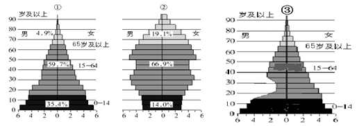 小题1:①③的塔基比较宽,说明青少年儿童的比重较大,塔顶比较窄,说明老年人的人口比重较小,是发展中国家。②的塔基较窄,说明青少年儿童比重小,塔顶宽,老年人口比重大,是发达国家。