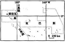 4、单选题 系列电影《加勒比海盗》中有一部叫做《世界的尽头》。近日,一支探险队经过长期调查后确认,位于太平洋的热带岛国基里巴斯是地球上最早迎接日出的地方,是名副其实的“世界的尽头”。读下图“基里巴斯位置示意图”,回答下面的问题。