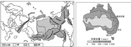 1.自然地理环境由气候、地形地貌、水文、生物、土壤等要素构成,俄罗斯自然地理要素分布图中图例甲、乙、丙表示的自然地理要素是2.根据澳大利亚年降水量分布图,关于澳大利亚降水量分布规律及成因叙述错误的是