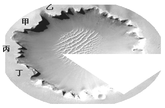 本题解析:本组题主要考察根据阴影判断地势高低、干旱地区的自然特征和地貌对自然景观形成的影响。1由图可知,此时光线从图的西面射入,甲乙丙丁中,甲地阴影最长,故地势最高。选A? 2图中网状景观实际上是风力堆积形成的沙垄,在干旱地区比较常见。也符合火星表面干燥的事实,选B答案。3P地没有形成图片中部的沙垄,是由于坡度较大,沙粒在重力作用下会向下滑动在盆地地区堆积。故C答案正确。