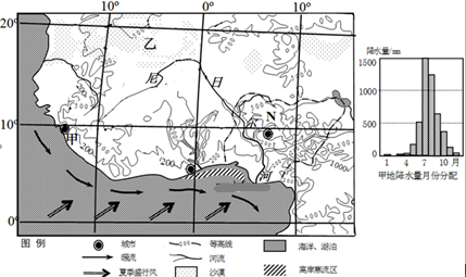 5、综合题 (13分)阅读世界某区域地形示意图(左图)和甲地河流流量的时间变化曲线图(右图),完成下列各题。