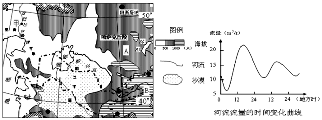 (4)读右图,阐述甲地在图示两天时间内河流流量变化的异同,并从天气角度分析原因。(5分)