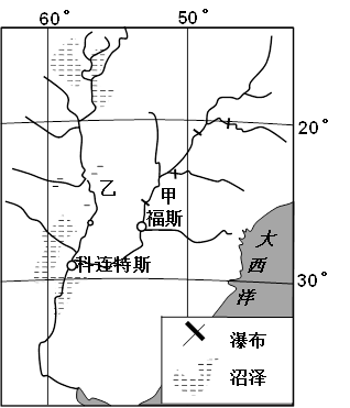 小题1:根据图中经纬度进行区域定位,结合实地情况来分析问题。依据经度向东减小,可知为西经;依据纬度向南增大,可知为南纬。陆地东侧为大西洋,故此地应位于南美洲大陆东岸。根据纬度可知当地气候主要为亚热带季风性湿润气候。从沼泽分布来看,主要分布在乙河流域上游和科连特斯附近,说明此处地势较周边低洼。在甲河上有较多的瀑布,且距离较近,表明该河流经处地势起伏较大。再根据沼泽形成的原因来分析甲地沼泽分布少的原因。依据图中河流的分布,可知甲河与乙河之间有分水岭,且为南北走向,故甲处位于来自大西洋湿润气流的迎风坡,应降水较多,故A错。下渗情况没有明显资料故无法进行比较。若甲处蒸发少,则地表水会丰富,应容易形成沼泽,与题干要求不符,故D错。结合瀑布的分布,可知甲处地势起伏大,不宜形成沼泽。故B正确。