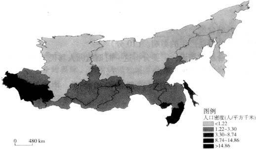 材料二:俄罗斯东部地区人口密度分布示意图。