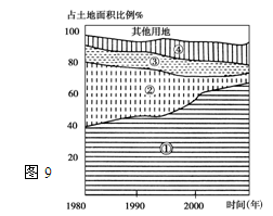 2、单选题 图9为某发达国家特大城市距离市中心4千米范围内城市主要功能区占土地面积比例变化示意图,读图完成问题。