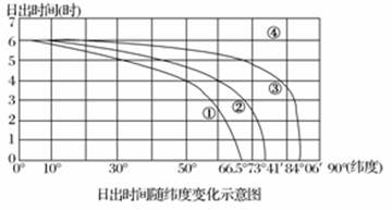 5、单选题 下图中的①、②、③、④四条曲线为四个日期的日出时间纬度分布。读图回答下列各题。