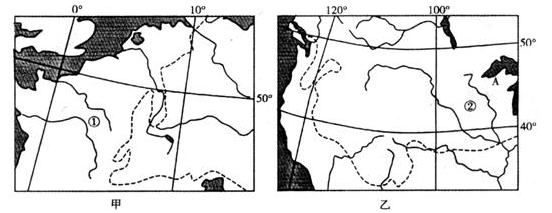 (2)两图所示的50°N地区,甲与乙比较,甲图所示地区冬季气候有什么特点?试分析其原因。(6分)