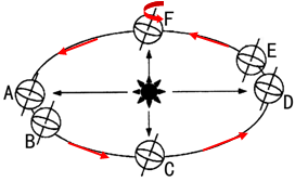 (1)在图中地球公转轨道上画出公转的方向。在F图地轴上画出自转方向。