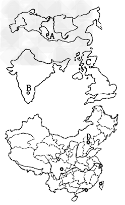 3、单选题  读下面A、B、C、D四国某相同的工业部门分布示意图,回答1—2题。