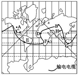 材料二 为了充分利用太阳能资源,科学家设想,把全球太阳能电站联成网络(如下图所示,图中A、B、C、D、E、F、G、H为世界上一些太阳能资源丰富地区),以便在昼夜半球之间调节太阳能的余缺。