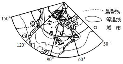 【小题2】结合图文信息找出晨昏线,④城为白天,此图为北半球局部地区图,判断图中经线是西经,最后判断60°W的时间为0点钟,最后读出(计算出) ③城(约为120°W)的地方时约20点钟,因此选D。
