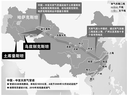 材料一: 2009 年 12 月 12 日,中国国家主席胡锦涛和哈萨克斯坦总统纳扎尔巴耶夫共同出席中哈天然气管道竣工仪式,并共同按下管道启动按钮。中国一中亚天然气管道起始于土库曼斯坦,经乌兹别克斯坦、哈萨克斯坦到达中国霍尔果斯,该管道的竣工通气,标志着中国与中亚能源合作取得重要进展。