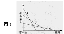 3、单选题 图4为城市各功能区付租能力与距城市中心距离关系示意图。与线段a、b、c付租能力相对应的城市功能区分别是