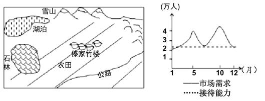 左图是“我国西南部地区某村镇旅游资源分布示意图”,右图是“该地区旅游接待能力与市场需求关系图”,读图回答下列问题。