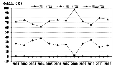 5、单选题 产业贡献率指各产业增加值增量与GDP增量之比,下图是北京市的2001~2012年三次产业贡献率统计图。完成下题。
