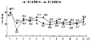 2、单选题  甲图为2010年安徽省轻、重工业增速分月比较图,乙图为安徽省2010年1~12月份部分市累计工业增加值及累计工业增速比较统计图。完成下题。